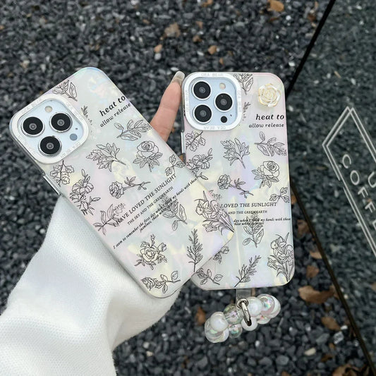 Diamond Marble Flower Case With Chain Pendant & Camera Ring - iPhone