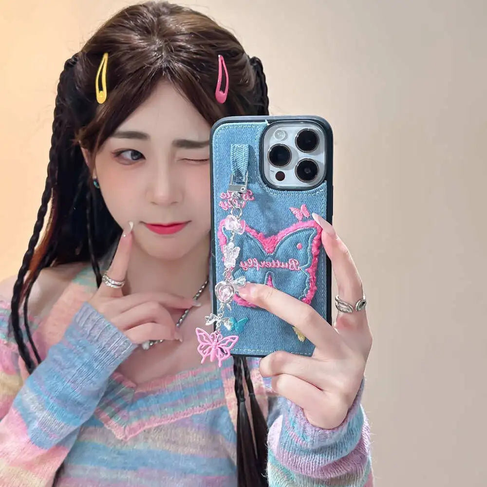 iPhone 15 Series Butterfly Jeans Pendant Case